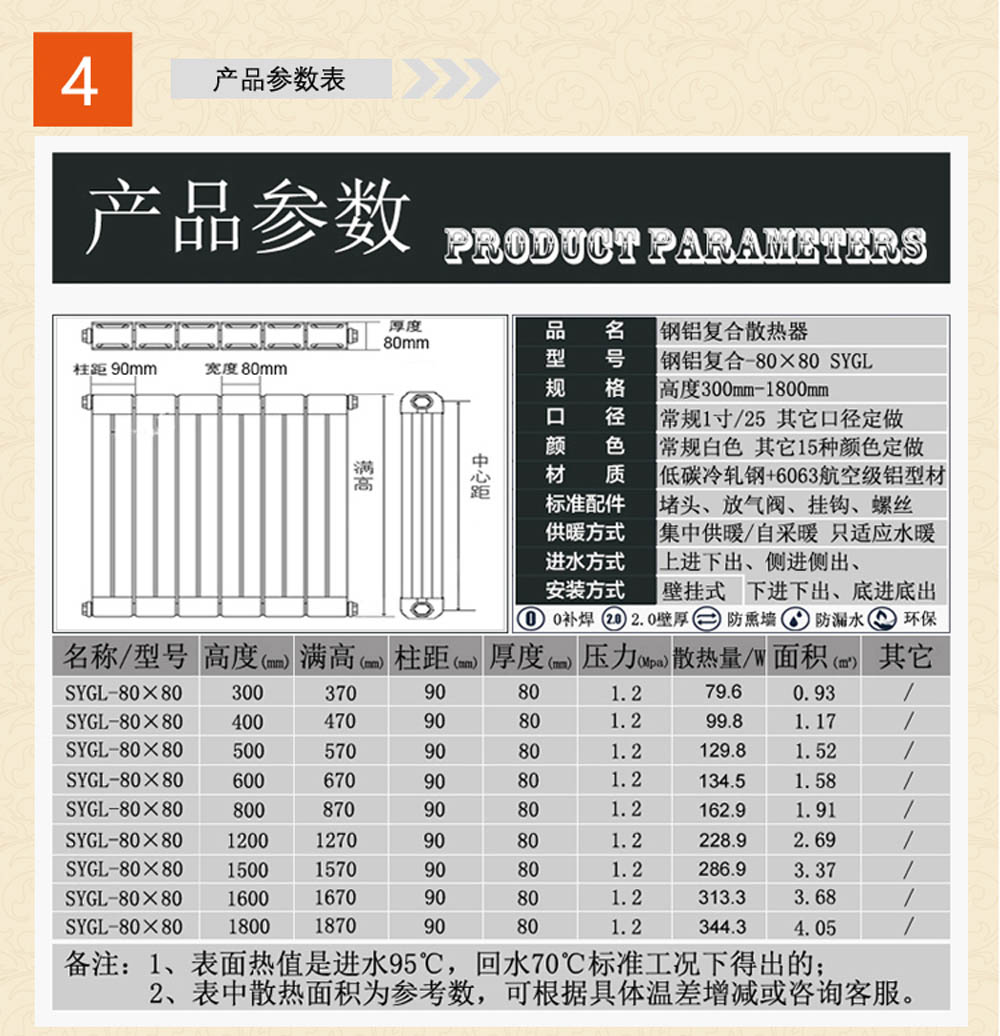 ◎ 成分:用Q195型低碳冷轧钢管做为导水管及6063型航空级铝型材做为散热翼◎ 片宽:80mm