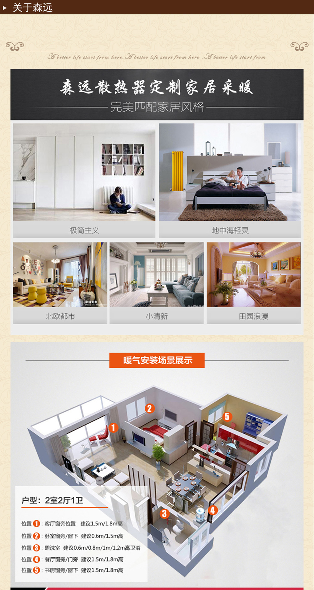 d、产品装饰性较好,勿再加暖气罩,避免降低散热量。