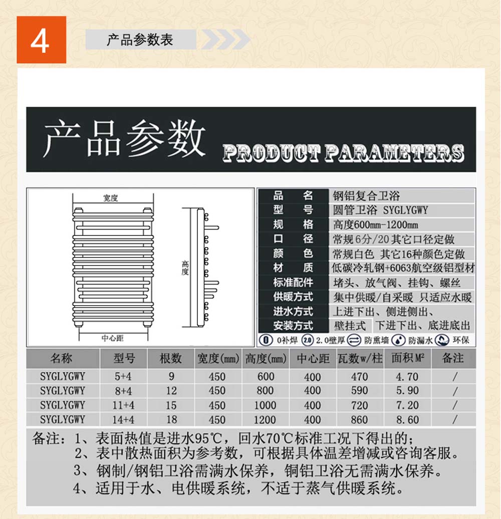 d、产品装饰性较好,勿再加暖气罩,避免降低散热量。